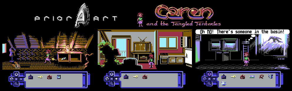 Schönes Point and Click Adventure von 2015 für C64. Caren and the Tangled Tentacles Finale Version 1.1 gibt es hier: [http://csdb.dk/release/?id=141659] Offizielle Seite: [http://martinwendt.de/caren/] Video (deutsch) [https://www.youtube.com/watch?v=R4P60l_Myo4] [http://2.bp.blogspot.com/-jxLPKqicuZc/Vokpq51beEI/AAAAAAAAFdw/xUZfU-HG_Qw/s1600/c64%2B-%2Bcaren.png] |
