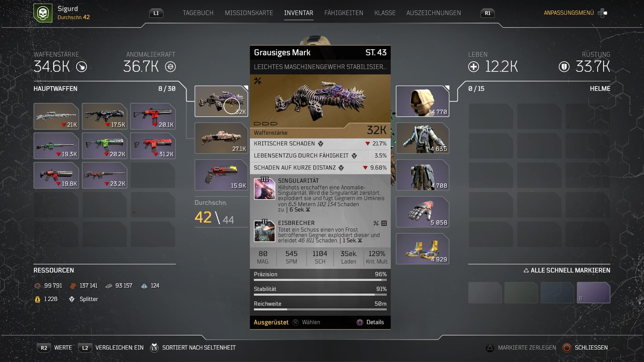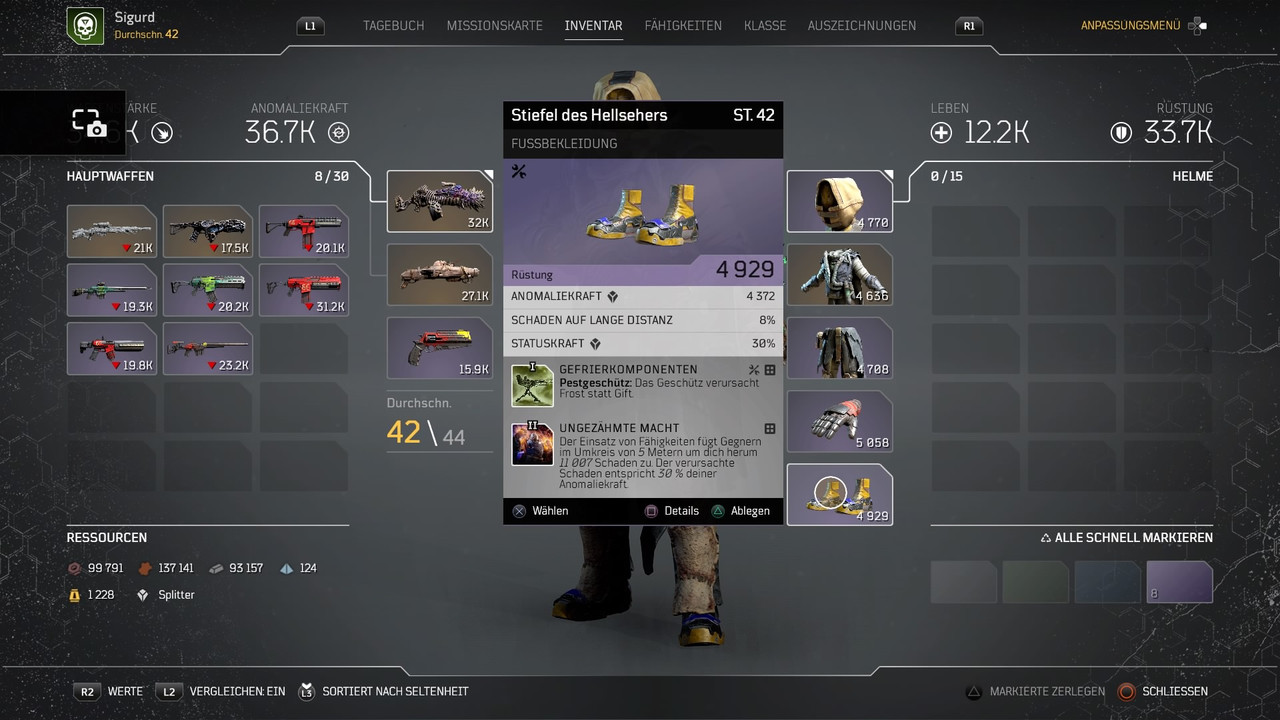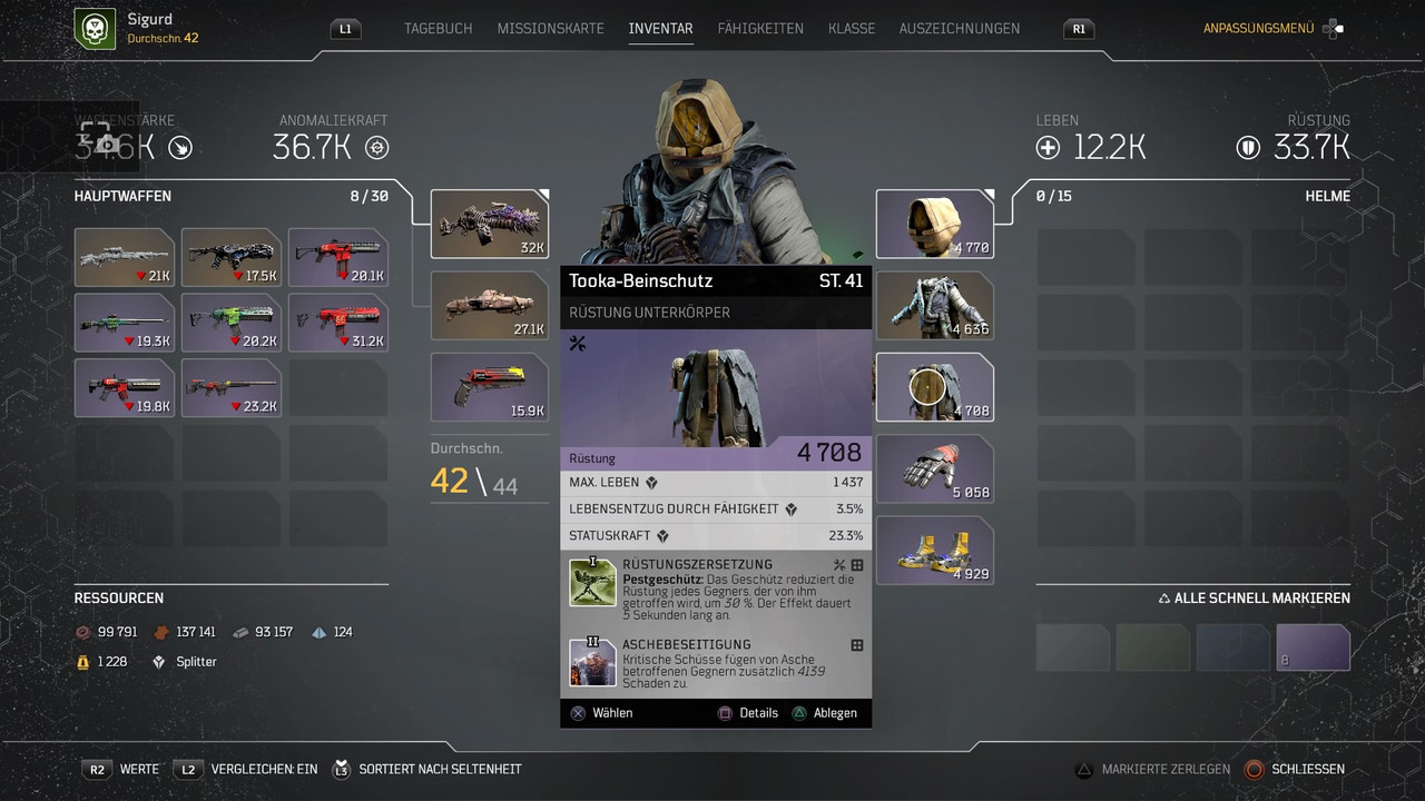 Erst einmal vielen Dank für die ausführliche Darstellung! Dein Equipment ist ja vom Level nicht mal maximiert - schaffst du mit diesem Build auch schon 15er Expeditionen?! Auf jeden Fall hast du in deinen Mods und den jeweils drei "Skills" deiner Waffen eigentlich keinerlei, äh, Reibungsverlust! Höchstens Move Groove wirkt auf den ersten Blick nicht so stark, aber zum einen kann ich die Skalierung der Charakterwerte noch recht schlecht einschätzen, zum anderen: haben oder nicht haben. :-) Critstack ist zusammen mit deinem Nonstop-Geballer sicher auch top, wobei generell noch deine Stats/Werte (via RT-Taste) interessant gewesen wären - vielleicht ist deine kritische Trefferchance eh schon hoch. Hast du eigentlich viel von deiner Ausrüstung erlootet oder beim Händler Tiago gekauft? Also insb. die beiden Setteile vom Plague Sower. Dessen Seteffekt, solltest du ein drittes Teil finden, wirkt auf den ersten aber nicht sooo gewaltig. Andererseits ist das "Stacks up" nicht weiter ausgeführt und wer weiß, wie hoch man die 5% Schadensreduktion stapeln kann, zumal du ja quasi immer Giftschaden machst. Da könntest du ggfs. sogar die Fixing Wave austauschen. Sniper in den Expeditionen fand ich bisher extrem unpraktisch, weil man halt meist von Gegnern überrannt wird, insofern könnte man im Skill Tree evlt. auf Sniper Master verzichten und einmal Nitrogen Capsules nehmen, um die lange Reichweite zu reduzieren (schließlich kriegt der Techomant klassenbedingt Bonusschaden auf lange Reichweite). Oder wenn man weiterhin Fixing Wave ausrüstet, evtl. Two Sides of the Power (15% mehr erlittenen Schaden, dafür 20% mehr ausgeteilter Schaden). (Nachgeschaut via [https://paradoxzyx.github.io/?c=technomancer]) Meine Charakter-/Spielerwerte im Normalzustand: [https://i.postimg.cc/tRsKf9zg/OUTRIDERS-20210801161119-Stats.jpg] Die Hauptwaffe "Grausiges Mark" (LMG): [https://i.postimg.cc/ZYXGzXfx/OUTRIDERS-20210801161138-Waffe1.jpg] Ich hätte gerne ein größeres Magazin. Die Skills passen gut, die Mods durchaus auch - auch wenn ich bei uns im Trio fast nie der Killer bin. Beim Eisbrecher steht leider nicht, wie weit die Explosion wirkt (die Übersetztung ist sicher ungenau). Die Zweitwaffe "Körperdieb" (Pumpgun): [https://i.postimg.cc/rwk7Kx2d/OUTRIDERS-20210801161209-Waffe2.jpg] Mit der bin ich wenig zufrieden, da drei Schuss einfach zu wenig sind, wenn man nicht wenigstens den Kopf trifft. Bei den Mods hab ich noch nix gemacht. Alle anderen Waffen im Iventar erscheinen mir schlechter. Die "Maske des Hellsehers": [https://i.postimg.cc/tCPLqDwQ/OUTRIDERS-20210801161217-Helm.jpg] Skills passen, die Mods musste ich anpassen und ich hab das Gefühl, dass der seismische Impuls zu wenig bringt. Die "Robe des Herrschers des Eises": [https://i.postimg.cc/W49yWyFr/OUTRIDERS-20210801161223-Ruestung.jpg] Das ist das Set, dass man gefühlt zwingend für einen mächtigen Frost-Build braucht ... Skills und Mods passen quasi perfekt. Der "Tooka-Beinschutz": [https://i.postimg.cc/MpmNRHz9/OUTRIDERS-20210801161227-Hose.jpg] Skills passen einigermaßen, Mods ursprünglich nicht, weswegen ich jetzt diese unnütze Aschebeseitigung habe. Die "Handschuhe des Inquisitors": [https://i.postimg.cc/wBxPkzvg/OUTRIDERS-20210801161231-Handschuhe.jpg] Skills wieder top, Mods gingen so (gibt bestimmt noch was Sinnvolleres als Individualabstand, auch wenn ich wegen meinen Turmeinsatzes viel auf kurze Entfernung kämpfe). Die "Stiefel des Hellsehers": [https://i.postimg.cc/Px9Rh8M5/OUTRIDERS-20210801161236-Schuhe.jpg] Schaden auf lange Distanz ist IMO in Expeditionen wenig relevant, die Mods musste ich auch anpassen. Ungezähmte Macht kann schon sinnvoll sein, v.a. wegen der Kälteeinbruch-Frostwelle, aber ich hab gefühlt noch zu wenig Anomaliekraft. Meine ausgerüsteten Skills/Fähigkeiten: [https://i.postimg.cc/QtHyRq1z/OUTRIDERS-20210801161247-Faehigkeiten.jpg] Hier sieht man mal die Bedeutung der Anomaliekraft: Mein Pestgeschütz macht bei fast 37k Anomaliekraft über 1.800 Schaden (was natürlich vergleichsweise ein Witz ist), während du mit knapp 24k AK auf fast 1.200 Schaden. Mein Cooldown ist da über 1 sec länger, was aber nicht so wichtig ist, da der Klassen-Bonuseffekt nach Aktivierung 10 sec dauert (der andere Effekt, den die Aktivierung vom Gefriergeschütz oder Kälteeinbruch auslöst, leider auch). Frage mich, ob ein einzelnes Gefriergeschütz überhaupt gegen ein auf Frost gemoddetes Pestgeschütz Land sieht durch bspw. schnellere und/oder längere Einfrierung. Mein Skill Tree: [https://i.postimg.cc/WzZf4b96/OUTRIDERS-20210801161340-Klasse.jpg] Ich habe auch mal geschaut, wie viele Mods ich aktuell habe: Rüstung: I 38/38, II 58/66, III 0/34 Waffe: I 25/25, II 26/26, III 6/43 Vorhin eine Expedition auf (nur) Rang 5 gemacht. Lebensgefahr bestand so gut wie nie, höchstens mal durch die schlecht sichtbare Area-of-Effect-Attacke der Brutmutter, die ja demnächst auch besser sichtbar werden soll. Aber wenn ich nicht extrem konsequent konstant Geschütze aktiviere für den kumulativen 10-sec-Boost und dann auch sofort alle Schüsse ins Ziel, am besten gefrorene Köpfe, bringe, ist der Schaden viel zu niedrig. Gegen Ende bin ich aus dem Tritt gekommen und hab nicht einmal Gold geschafft. >Ach ja, ich spiele auf XSX, dann wars das mit dem zusammen los legen! hehe Mir ist gerade noch eingefallen, dass OUTRIDERS ja komfortabel Cross-Platform-Multiplayer bietet - unser Trio spielt ja selbst so (PS4 Pro, XSX [der seine PS4 für dne Partychat laufen lässt] und ich auf PS4)! :-D Nur Chat wäre etwas aufwändiger (bspw. Discord via Handy). |