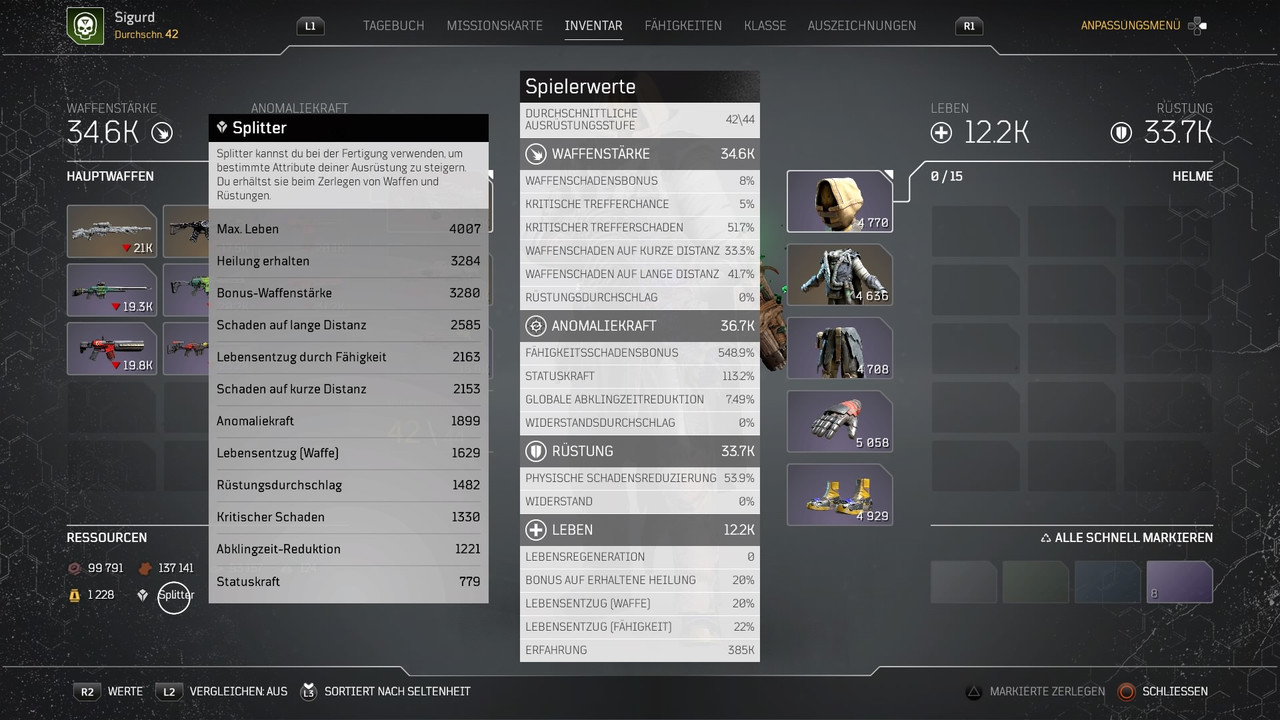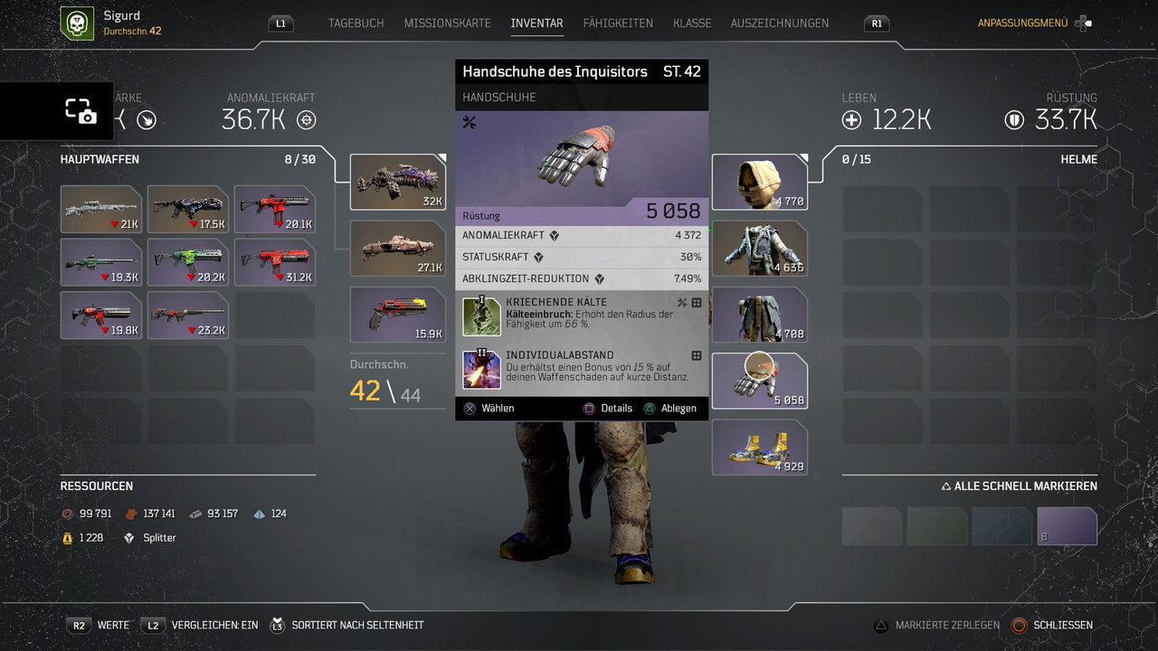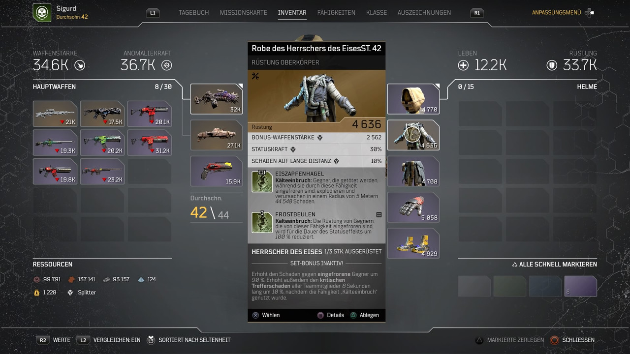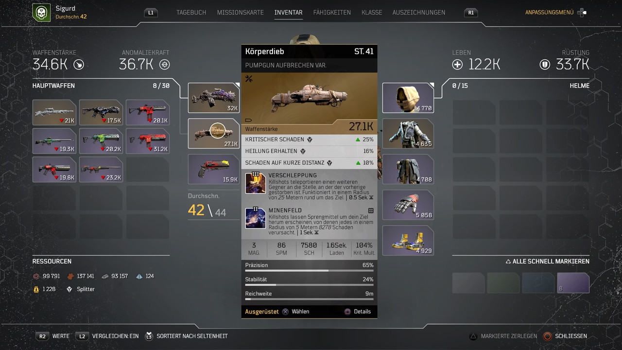 Erst einmal vielen Dank für die ausführliche Darstellung! Dein Equipment ist ja vom Level nicht mal maximiert - schaffst du mit diesem Build auch schon 15er Expeditionen?! Auf jeden Fall hast du in deinen Mods und den jeweils drei "Skills" deiner Waffen eigentlich keinerlei, äh, Reibungsverlust! Höchstens Move Groove wirkt auf den ersten Blick nicht so stark, aber zum einen kann ich die Skalierung der Charakterwerte noch recht schlecht einschätzen, zum anderen: haben oder nicht haben. :-) Critstack ist zusammen mit deinem Nonstop-Geballer sicher auch top, wobei generell noch deine Stats/Werte (via RT-Taste) interessant gewesen wären - vielleicht ist deine kritische Trefferchance eh schon hoch. Hast du eigentlich viel von deiner Ausrüstung erlootet oder beim Händler Tiago gekauft? Also insb. die beiden Setteile vom Plague Sower. Dessen Seteffekt, solltest du ein drittes Teil finden, wirkt auf den ersten aber nicht sooo gewaltig. Andererseits ist das "Stacks up" nicht weiter ausgeführt und wer weiß, wie hoch man die 5% Schadensreduktion stapeln kann, zumal du ja quasi immer Giftschaden machst. Da könntest du ggfs. sogar die Fixing Wave austauschen. Sniper in den Expeditionen fand ich bisher extrem unpraktisch, weil man halt meist von Gegnern überrannt wird, insofern könnte man im Skill Tree evlt. auf Sniper Master verzichten und einmal Nitrogen Capsules nehmen, um die lange Reichweite zu reduzieren (schließlich kriegt der Techomant klassenbedingt Bonusschaden auf lange Reichweite). Oder wenn man weiterhin Fixing Wave ausrüstet, evtl. Two Sides of the Power (15% mehr erlittenen Schaden, dafür 20% mehr ausgeteilter Schaden). (Nachgeschaut via [https://paradoxzyx.github.io/?c=technomancer]) Meine Charakter-/Spielerwerte im Normalzustand: [https://i.postimg.cc/tRsKf9zg/OUTRIDERS-20210801161119-Stats.jpg] Die Hauptwaffe "Grausiges Mark" (LMG): [https://i.postimg.cc/ZYXGzXfx/OUTRIDERS-20210801161138-Waffe1.jpg] Ich hätte gerne ein größeres Magazin. Die Skills passen gut, die Mods durchaus auch - auch wenn ich bei uns im Trio fast nie der Killer bin. Beim Eisbrecher steht leider nicht, wie weit die Explosion wirkt (die Übersetztung ist sicher ungenau). Die Zweitwaffe "Körperdieb" (Pumpgun): [https://i.postimg.cc/rwk7Kx2d/OUTRIDERS-20210801161209-Waffe2.jpg] Mit der bin ich wenig zufrieden, da drei Schuss einfach zu wenig sind, wenn man nicht wenigstens den Kopf trifft. Bei den Mods hab ich noch nix gemacht. Alle anderen Waffen im Iventar erscheinen mir schlechter. Die "Maske des Hellsehers": [https://i.postimg.cc/tCPLqDwQ/OUTRIDERS-20210801161217-Helm.jpg] Skills passen, die Mods musste ich anpassen und ich hab das Gefühl, dass der seismische Impuls zu wenig bringt. Die "Robe des Herrschers des Eises": [https://i.postimg.cc/W49yWyFr/OUTRIDERS-20210801161223-Ruestung.jpg] Das ist das Set, dass man gefühlt zwingend für einen mächtigen Frost-Build braucht ... Skills und Mods passen quasi perfekt. Der "Tooka-Beinschutz": [https://i.postimg.cc/MpmNRHz9/OUTRIDERS-20210801161227-Hose.jpg] Skills passen einigermaßen, Mods ursprünglich nicht, weswegen ich jetzt diese unnütze Aschebeseitigung habe. Die "Handschuhe des Inquisitors": [https://i.postimg.cc/wBxPkzvg/OUTRIDERS-20210801161231-Handschuhe.jpg] Skills wieder top, Mods gingen so (gibt bestimmt noch was Sinnvolleres als Individualabstand, auch wenn ich wegen meinen Turmeinsatzes viel auf kurze Entfernung kämpfe). Die "Stiefel des Hellsehers": [https://i.postimg.cc/Px9Rh8M5/OUTRIDERS-20210801161236-Schuhe.jpg] Schaden auf lange Distanz ist IMO in Expeditionen wenig relevant, die Mods musste ich auch anpassen. Ungezähmte Macht kann schon sinnvoll sein, v.a. wegen der Kälteeinbruch-Frostwelle, aber ich hab gefühlt noch zu wenig Anomaliekraft. Meine ausgerüsteten Skills/Fähigkeiten: [https://i.postimg.cc/QtHyRq1z/OUTRIDERS-20210801161247-Faehigkeiten.jpg] Hier sieht man mal die Bedeutung der Anomaliekraft: Mein Pestgeschütz macht bei fast 37k Anomaliekraft über 1.800 Schaden (was natürlich vergleichsweise ein Witz ist), während du mit knapp 24k AK auf fast 1.200 Schaden. Mein Cooldown ist da über 1 sec länger, was aber nicht so wichtig ist, da der Klassen-Bonuseffekt nach Aktivierung 10 sec dauert (der andere Effekt, den die Aktivierung vom Gefriergeschütz oder Kälteeinbruch auslöst, leider auch). Frage mich, ob ein einzelnes Gefriergeschütz überhaupt gegen ein auf Frost gemoddetes Pestgeschütz Land sieht durch bspw. schnellere und/oder längere Einfrierung. Mein Skill Tree: [https://i.postimg.cc/WzZf4b96/OUTRIDERS-20210801161340-Klasse.jpg] Ich habe auch mal geschaut, wie viele Mods ich aktuell habe: Rüstung: I 38/38, II 58/66, III 0/34 Waffe: I 25/25, II 26/26, III 6/43 Vorhin eine Expedition auf (nur) Rang 5 gemacht. Lebensgefahr bestand so gut wie nie, höchstens mal durch die schlecht sichtbare Area-of-Effect-Attacke der Brutmutter, die ja demnächst auch besser sichtbar werden soll. Aber wenn ich nicht extrem konsequent konstant Geschütze aktiviere für den kumulativen 10-sec-Boost und dann auch sofort alle Schüsse ins Ziel, am besten gefrorene Köpfe, bringe, ist der Schaden viel zu niedrig. Gegen Ende bin ich aus dem Tritt gekommen und hab nicht einmal Gold geschafft. >Ach ja, ich spiele auf XSX, dann wars das mit dem zusammen los legen! hehe Mir ist gerade noch eingefallen, dass OUTRIDERS ja komfortabel Cross-Platform-Multiplayer bietet - unser Trio spielt ja selbst so (PS4 Pro, XSX [der seine PS4 für dne Partychat laufen lässt] und ich auf PS4)! :-D Nur Chat wäre etwas aufwändiger (bspw. Discord via Handy). |