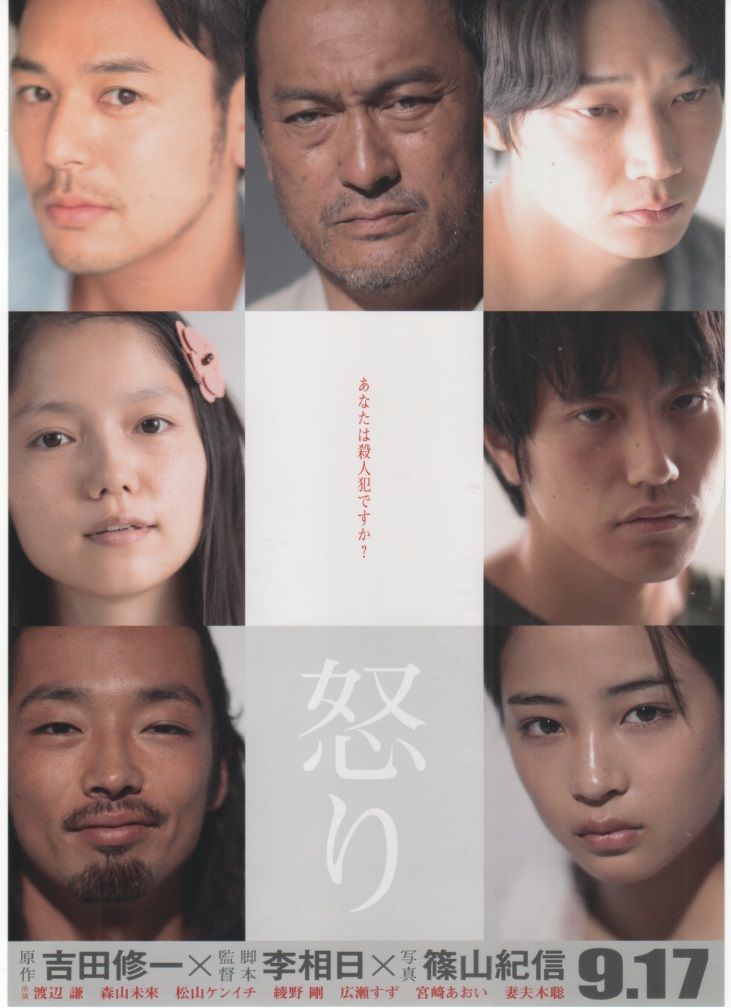 In Hachioji einer Vorortstadt von Tokio wird ein verheiratetes Paar brutal umgebracht. Der Mörder kann fliehen. Die Polizei ist ratlos über das Motiv der Tat. Der Mörder hat lediglich mit dem Blut der Opfer das Wort "怒り" an eine der Zimmertüren geschmiert. Durch Zeugenaussagen kann die Polizei drei zum Teil ähnliche und sich doch unterscheidende Phantombilder erstellen, die in einer TV-Sendung zu einem landesweiten Fahndungsaufruf führen. Unterdessen werden dem Filmzuschauer an drei verschiedenen Orten in Japan, drei junge Männer vorgestellt, von denen einer der Mörder ist. Sie alle sind erst kürzlich an diese Orte gekommen, jeder von ihnen, so scheint es, mit einer anderen Motivation und Hintergrundgeschichte. Die Menschen(ein junges Mädchen in Okinawa, ein junger erfolgreicher Homosexueller in Tokio und die junge Tochter eines Fischer in Chiba), die diesen Männern begegnen und vertrauen, erfahren davon, wie auch von der Fahndungssuche nach ihnen, nur Stück für Stück. Aber es wird ihr zukünftiges Verhältnis zu ihnen nachhaltig beeinflußen Für den Zuschauer jedoch ist die Charakterisierung der Männer aufgrund des Filmauftaktes von Vorhinein schwer belastet. In jeder Situation und Dialog mit ihnen sucht man nach Hinweisen für die Täterschaft. Sie alle liefern durch geschickt gesetzte Szenen Gründe für die Tat, aber eben auch genügend Zweifel dagegen. Der Film ist dennoch kein Rätselkrimi, in dem es darum geht den Mörder herauszufinden. Er ist vielmehr ein Drama, das versucht die Motive des Mörders zu ergründen und die Auswirkungen der Tat. Elegant wechselt der Film dabei zwischen den Orten und Charakteren hin und her ohne sich dabei wirr zu verheddern. Denn die tragischen Geschichten an allen drei Orten, die sich jeweils in einem kleinen sozialen Mikrokosmos abspielen, liefern zum Ende eine bedeutendere Erkenntnis, die zu Anfang des Films noch überhaupt nicht ersichtlich war. Gefiel mir ausgesprochen gut, weil er ruhig erzählt und fantastisch gespielt ist. 4 von 5 [https://www.youtube.com/watch?v=g0O6gEqSqnI] [http://livedoor.blogimg.jp/isshikityoumin/imgs/8/6/867b2a74.jpg] |