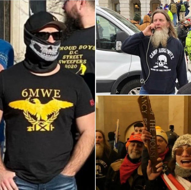 Alter, wer trägt sowas öffentlich? 6MWE = 6 million wasn't enough (bezogen auf getötete Juden) und "Camp Ausschwitz". Fine people... [https://pbs.twimg.com/media/ErIiuqXXMAEcPiA.jpg] Und sie wollten Bürgerkrieg: [https://pbs.twimg.com/media/ErJROZFUcAENxJ5.jpg] [https://pbs.twimg.com/media/ErI1pRzXUAcOMbr.jpg] |