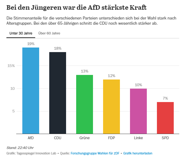 Man hat gewonnen wegen alten und weiblichen Wählern. Man ist nicht diktatursozialisiert. Auch schön: "Auffällig ist dagegen auch, wie stark die AfD über die anderen Altersgruppen hinweg ist: Bei den Senioren kommt sie auf 18 Prozent, bei den 45- bis 59-Jährigen auf 27 Prozent und bei den 30- bis 44-Jährigen sogar auf 30 Prozent. Am beliebtesten ist die AfD somit bei den Menschen, die die DDR gar nicht mehr erlebt haben – oder nur als Kinder." Es liegen fundamentale und strukturelle Probleme vor wenn die AFD bei den "jungen" Wählern auf solche Stimmanteile kommt. Hier gibt es nichts zu feiern, die Bombe tickt weiter. [https://www.tagesspiegel.de/politik/waehler-ohne-ddr-hintergrund-afd-staerkste-kraft-bei-unter-30-jaehrigen/27261034.html] [https://i.postimg.cc/mDFbGY74/U30.png] [https://i.postimg.cc/prJM2qTw/60.png] |