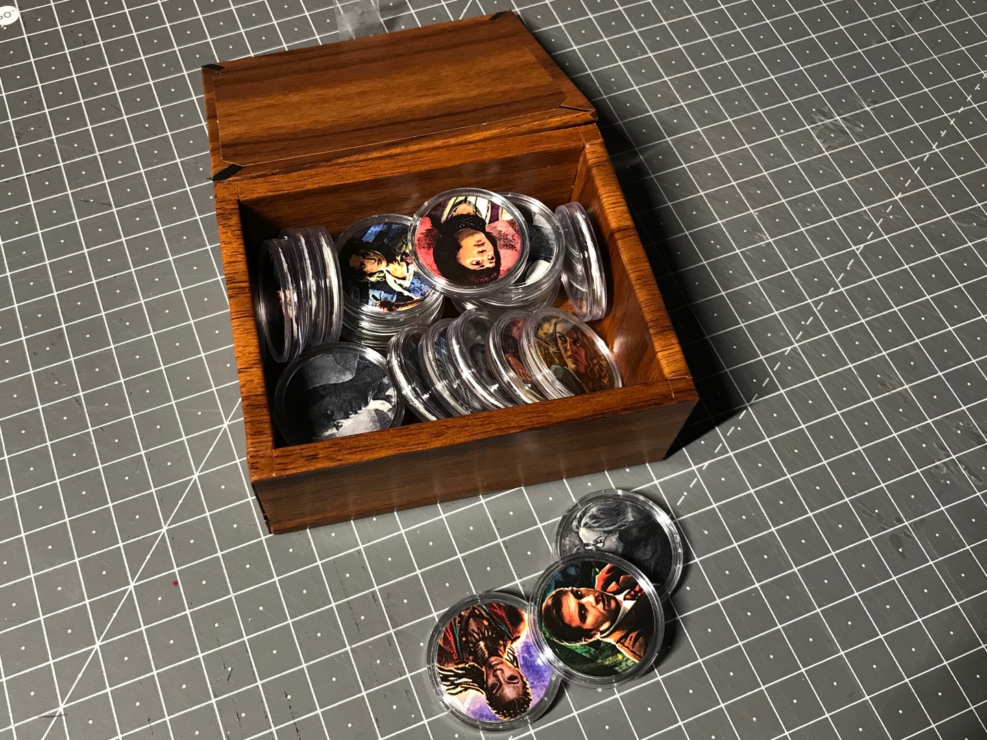 Statt der kleinen Ermittlerkarten benutzen wir selbstgemacht Ermittler-Token. Schutzkapseln für Münzen, darein dann das ausgedruckte Ermittlerprotrait, fertig. Eine Box dafür wurde dann auch noch angefertigt: [https://www.blindsicht.de/stuff/arkham-investigatorbox02.jpg] Und hier habe ich sogar ein fast komplett bestücktes Foto der Holzbox: [https://www.blindsicht.de/stuff/arkham-box08.jpg] Die Box ganz rechts für die Token liegt inzwischen etwas höher, da mittlerweile darunter noch ein Stapel Acryl-Pfeilmarker liegt womit wir die Verbindungen der einzelnen Orte visualisieren.. :) |