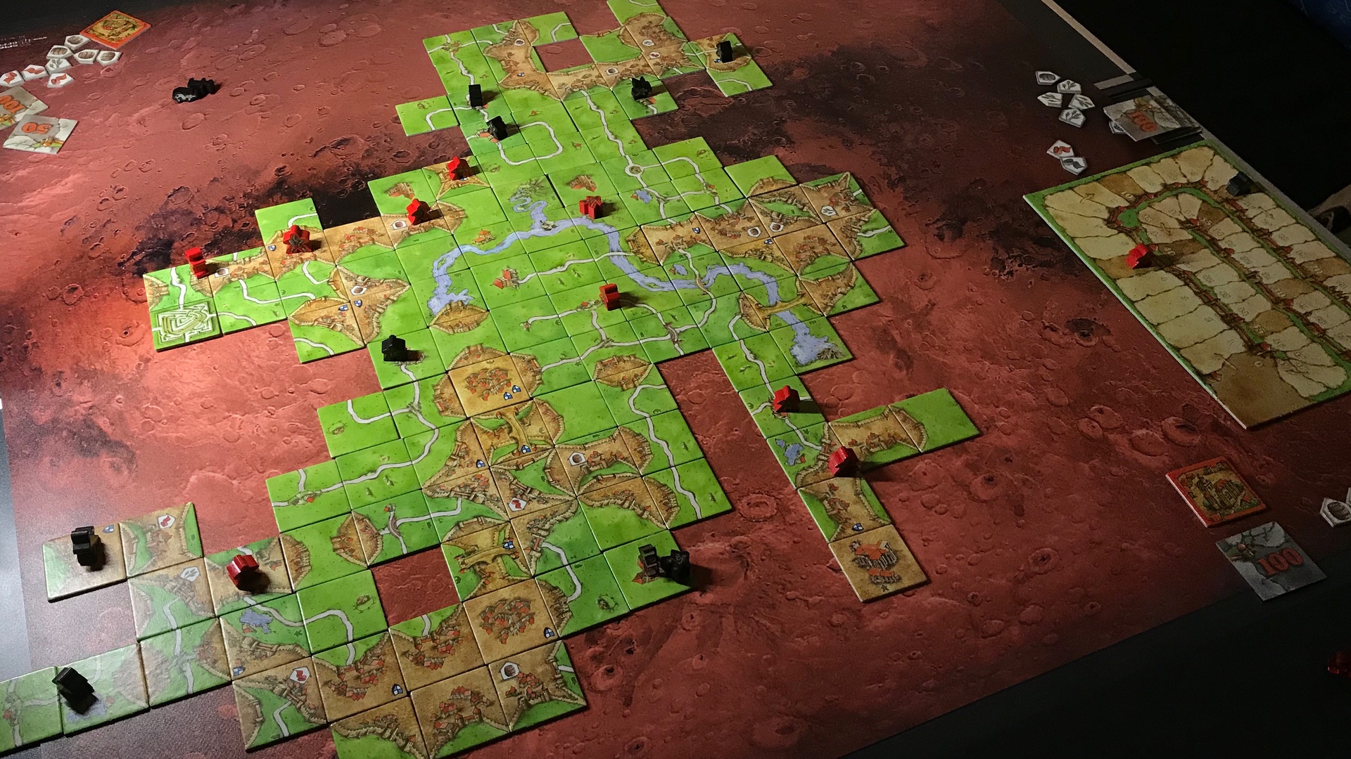 Ich hatte ja geschrieben das mir noch weitere Spiele eingefallen sind, also: Carcassonne Der Dauerbrenner bei uns. Passt eigentlich zu keiner deiner Anforderungen wirklich, aber schon seit vielen Jahren ist bisher jeder begeistert gewesen mit dem ich es gespielt habe. Ein Plättchenlegespiel. Man zieht aus einem Sack ein Landschaftsplättchen und legt es irgendwo wo es nach den Anlegeregeln passt, an die bereits ausliegende Landschaft an. Man hat ein paar Figuren mit denen man dann zB. Strasse, Städte oder die Wiesen besetzen kann. Ist eine Strasse oder eine Stadt abgeschlossen gibt es für den entsprechenden Spieler Punkte. In gewisser Weise passt es also zu deinem Punkt "Gerne darf diese Welt im Laufe des Spiels auch erst entstehen." Man kann dabei seine Mitspieler gut ärgern wenn man möchte in dem man versucht deren Städte/Straßen zu übernehmen, oder in dem man deren Pläne durchs anlegen eigener Plättchen durchkreuzt, man kann wenn man will aber auch "nebenher" spielen. Also schon auf dem gleichen Spielfeld, aber versuchen Punkte zu bekommen OHNE den anderen Punkte abzuluchsen. Ein deutsches Spiel eines deutschen Spieleautors. Es gibt inzwischen haufenweise kleine und große Erweiterungen und auch die Spielergemeinde ist da sehr kreativ so dass man auch auf viieeeele Fanerweiterungen zugreifen kann wenn man möchte. Mit dem Grundspiel kann man schon viel Spaß haben, für mich gehört aber mindestens noch die erste und zweite Erweiterung ("Wirtshäuser und Kathedralen" sowie "Händler und Baumeister") zu einem wirklich runden "Basisspiel". Vermutlich weil ich es in diesem Umfang damals kennengelernt habe. :) Es gibt eine aktuelle Bigbox in der sich neben dem Grundspiel und den beiden genannten Erweiterungen auch ein paar Mini-Erweiterungen befinden. https://www.hans-im-glueck.de/spiele/carcassonne-bigbox-21.html Sollte es dich interessieren, noch folgender Hinweis: Mit der Bigbox wurde sozusagen "Carcassonne 3.0" eingeführt. Sprich: Das Grafikdesign der Plättchen wurde zum 3ten Mal in rund 20 Jahren verändert. Spieltechnisch sind alle Editionen und Erweiterungen untereinander kompatibel, nur optisch halt nicht. Für Carcassonne 3.0 gibt es bisher noch nicht jede Erweiterung im passenden Stil, ist aber, soweit ich weiss, geplant (Zumindest jede große Erweiterung. Die Mini-Erweiterungen werden hier und da zwar mal ans neue Design angepasst oder es kommen neue mit dem jeweils aktuellen Design raus, aber es gibt nicht jede Mini-Erweiterung in jedem Grafikstil) Vorsicht, Suchtgefahr. Ich kenne mittlerweile Leute die zB. die Wohnzimmertür aushängen und als Spieltisch verwenden weil ihnen der normale Tisch nicht mehr für die Anzahl an Plättchen (Teils wird mit mehreren Grundspielen + X Erweiterungen gespielt) ausreicht.Auch bei uns besteht die "Spielbasis" inzwischen aus Grundspiel und 5 bestimmten Erweiterungen die wir immer dazu nehmen + dann noch Erweiterungen nach Wahl je nachdem wie wir gerade Bock haben. :) Wir selbst spielen die erste Edition aber mischen diese bei Bedarf auch mit Erweiterungen der zweiten Edition. [http://www.blindsicht.de/stuff/carcassonne02.jpg] So sah das Match gegen jemanden hier aus dem Forum aus: [http://www.blindsicht.de/stuff/carcassonne03.jpg] Es gibt auch offizielle Umsetzungen für die Switch sowie Android und iOS. Fallout - Das Brettspiel Vorsicht, ich meine NICHT "Fallout Wasteland Warfare" und auch nicht "Fallout Shelter" Das Spiel ist ab 14 Jahren gedacht. Es ist halt ein Fallout, also Endzeit ind er man, wenn auch nur in Textform auch schon mal auf die eine oder andere Leiche trifft. Da kannst du deine Tochter besser einschätzen ob es was wäre. Man wählt eine Mission aus, baut entsprechend das Spielfeld auf, wobei die meisten Spielfeldteile verdeckt und zufällig ausgelegt werden. Man entdeckt die Spielwelt also erst beim Spielen. Und dann: Naja, Fallout halt. :) Meine Spielpartnerin ist großer Fan der Videospiele und meint dass das Brettspiel die Atmosphäre etc. der Videospiele wirklich hervorragend umsetzt. Man hat eine Mission, streift durch das Wasteland, bekämpft herumstreifende Gegner entdeckt Orte, Kauft/verkauft Gegenstände, entdeckt Sidequests etc pp. Bei dem spiel sind rund 200 Karten bei. Jede Mission sagt dir welche Karten am Anfang ausliegen. Dies sind dann die Jeweiligen Story-/Questanfänge. Hat man eine der genannten Bedingungen im Spiel erfüllt, geht es entsprechend weiter mit anderen Karten etc pp. Es gibt auch Zufallsereignisse, man kann je nach Questreihe und eigenen Entscheidungen neue Orte mit neuen Quests entdecke etc. Da man eigentlich sogst wie immer 2-3 Auswahlmöglichkeiten bei einer Quest oder einem Ereignis hat UND manchmal auch Würfelproben verlangt werden wo je nach Ergebnis der Verlauf sich ändert, verläuft jedes Spiel anders. Offiziell spielt man in dem Spiel gegeneinander (wobei man sich halt nicht gegenseitig bekämpft sondern auch zusammenarbeiten kann, aber es dann drauf ankommt wer am Ende mehr Punkte hat), wobei beide Spieler allerdings auch die gleichen Siegbedingungen haben können. Für bestimmte Quests oder Storyentwicklungen gibt es halt Punkte. Problem: Die Siegbedingungen können quasi irgendwann mitten drin erfüllt sein, ohne dass eine Quest, eine Story abgeschlossen ist. Das kann sehr unbefriedigend sein. Ignoriert man die Siegbedingungen allerdings, kann man das Spiel auch hervorragend gemeinsam erleben. Dann spielt man halt zB. bis die Hauptquest erledigt ist oder so. (und könnte dann immer noch seine Punkte vergleichen um zu gucken wer der bessere Spieler war, wenn das einem wichtig ist). Es gibt auch mit New California eine offizielle Co-Op Erweiterung, aber mit ignorieren der Sieg- bzw. Endbedingung des normalen Spieles kann man auch dieses hervorragend im CoOp spielen. [http://www.blindsicht.de/stuff/fallout03.jpg] [http://www.blindsicht.de/stuff/fallout05.jpg] Und zu guter Letzt: Terraforming Mars Ein klassisches Eurogame. Also viel Ressourchenmanagement. Es geht darum