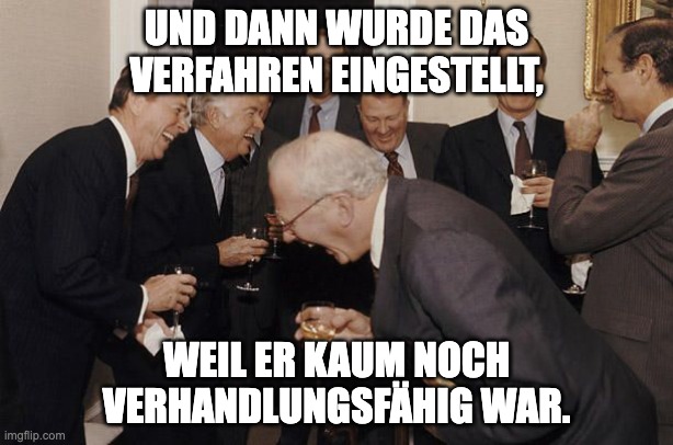 >Dem 82 jährigen Olearius gehts halt nicht so gut. Da hat die Staatsanwaltschaft so richtig Mitleid bekommen und ist sich mit der Verteidigung einig geworden das man den armen, alten Mann nun doch nicht mehr wegen so einem Käse dermaßen vor Gericht strapazieren kann. Ging ja auch nur um insgesamt ca. 280 Mio Steuerhinterziehung. Da werden beim Bundes Olav heute sicher die Korken knallen, da ihm jetzt wohl auch kein Staatsanwalt mehr wegen diesem Filrfanz auf die Nerven gehen wird. > Hab den Gedanken mal illustriert [https://i.imgflip.com/8uzkvi.jpg] >[https://www.zeit.de/wirtschaft/2024-06/warburg-cum-ex-christian-olearius-steuerprozess] |