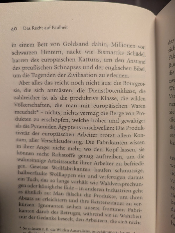 So werte Leser, zum Jahresende hin hat mich dann doch etwas die Lesewut gepackt und so kann ich ich hier wieder zehn Titel vorstellen Charles W. Mills – The Racial Contract [https://www.amazon.de/Racial-Contract-Charles-W-Mills/dp/1501764284/?tag=maniacforum-21] Wie ich schon im 17. Teil schrieb hatte ich mir vorgenommen mich in die ganzen „Kritischen bzw. Post-irgendwas Theorien“ etwas einzulesen. Mehr als ein oder zwei Bücher pro Thema waren jetzt auch nicht drin, aber was wäre das auch hier in politischen oder ähnlich gelagerten Diskussionen überhaupt wert? Wie ich schon schrieb kamen Robin DiAngelo und Ibram X. Kendi für mich nicht in die Tüte, so weit geht meine Ambiguitätstoleranz dann auch nicht. Ich bin über Umwege auf diesen Vortrag gestoßen, den ich hier wirklich allen nur wärmstens empfehlen kann und der sehr gut darstellt wieso sich das W-Wort mit der Aufklärung beisst und obendrein dies an einem Fall aus Neuseeland (und nicht wie immer USA) aufzeigt. [https://www.youtube.com/watch?v=WsntpZP79V4] Der Vortragende stellt natürlich auch einige Bücher vor, hellhörig wurde ich aber als er explizit empfahl das Buch von Charles Mill zu lesen. Und yep, ich bereue keinen Meter es gelesen zu haben, für viele Argumente und Thesen kann man auch nichts anderes als Verständnis entgegenbringen, aaaaaaber spätestens im Schlussdrittel dachte ich mir: Oenri Boem entkräftigt mit seinem Buch „Radikaler Universalimus“ einen Großteil seines Buches. (Für die, die es gelesen haben: Mir geht es vor allem um den Part, dass die amerikanische Verfassung sich nur auf weiße Männer bezog) Frantz Fanon – Die Verdammten dieser Erde [https://www.amazon.de/Verdammten-dieser-Erde-suhrkamp-taschenbuch/dp/3518371681/?tag=maniacforum-21] Auf Fanon bin ich das erste mal aufmerksam geworden als folgender Comic Buch des Monats in den „Blättern“ war. Seit dem war mein Interesse für ihn geweckt, afrikanische Literatur habe ich schon gelesen, aber was im weiteren Sinne philosophisches (Albert Camus und Khalil Gibran zählen nicht) war bisher Fehalanzeige. [https://www.amazon.de/Frantz-Fanon-Fr%C3%A9d%C3%A9ric-Ciriez/dp/386854352X/?tag=maniacforum-21] [https://www.rosalux.de/mediathek/media/element/1764] [https://www.youtube.com/watch?v=P7ZXuMu7I0o] Übrigens lesen in der ersten Staffel von „White Lotus“ die beiden Mädels am Pool neben Nietzsche auch Fanon worauf ich oller Klugscheißer auch aufmerksam gemacht hab. (BTW: Die zweite Staffel wischt mit der okayen ersten sowas von den Boden aus. Allein die dritte Folge ist *chefskiss* Achtet mal auf die Klamotten und von Meghann Fahys Leistung will ich erst gar nicht anfangen) Doch zurück zu Fanon: Sehr schlau, zornig, sehr gut. Wo ich mit ihm sowas von d'accord gehe, dass „Afrika“ (ist ja quasi 1 Land) einen afrikanischen Weg gehen muss... auf dass unsere Ingenieure in 50 -100 Jahren von den dortigen lernen. Herausheben möchte ich noch das letzte Kapitel in dem der Psychotherapeut Fanon medizinische/psychologische Fälle aus seiner Laufbahn schildert. Oh boy, die haben es echt in sich und sollten der ganzen hiesigen „Wir brauchen Woffn Woffn Woffn“-Fraktion vorgelesen werden. (Folterer sind nicht mehr in der Lage weiter zu foltern ist echt noch harmlos. Colin Crouch – Postdemokratie [https://www.amazon.de/Postdemokratie-suhrkamp-Colin-Crouch/dp/3518125400/?tag=maniacforum-21] [https://de.wikipedia.org/wiki/Postdemokratie] Interessante These, der man nur zustimmen kann. Es langt aber wenn ihr den Wiki-Artikel lest. Anton Jäger – Hyperpolitik [https://www.amazon.de/Hyperpolitik-Extreme-Politisierung-politische-suhrkamp/dp/3518127977/?tag=maniacforum-21] Der Begriff wurde mir durch den gleichnamigen Jacobin-Podcast bekannt. [https://www.youtube.com/watch?v=4sLu4ED0coI] Jacobin Podcast Hier langt es noch viel mehr sich mit Jägers These kurz vertraut zu machen, denn das ganze auf ein Büchlein auszuweiten war unnötig. Witzigerweise spoilert Jäger fast sämtliche Romane von Houellebecq... passt also perfekt, dass ich mit dem jetzt in Zukunft zuwenden wollte. Was aber Jäger sehr schön formuliert: Der Literarische Seismograf registriert Politik wie z.B. das Ende der postpolitischen Ära. Heinrich Böll - Die verlorene Ehre der Katharina Blum: oder: Wie Gewalt entstehen und wohin sie führen kann [https://www.amazon.de/Die-verlorene-Ehre-Katharina-Blum/dp/3423011505/?tag=maniacforum-21] [https://www.youtube.com/watch?v=bWPdnef55qc] Die Kurzfassung in Playmobil :D [https://www.youtube.com/watch?v=kTObPXYU7sA] Klassiker der Weltliteratur Ich mag Böll. Schon „Die Ansichten eines Clowns“ fand ich gut. Hier schafft es Böll mich zu berühren, an einer Stelle überkam mich einfach nur großes Mitleid. Das Schlimme: Was früher und heute immer die BILD war und ist, machen SPON & Co allmählich nach. Thomas Mann – Der Tod in Venedig [https://www.amazon.de/Tod-Venedig-Novelle-Thomas-Mann/dp/3103971842/?tag=maniacforum-21] Tja, da hat man Böll gelesen – seines Zeichens immerhin Literaturnobelpreisträger und dann liest man „Der Tod in Venedig“ und muss sofort an ein Schiller-Zitat denken: „Gegen Goethe bin und bleibe ich ein poetischer Lump“ Alter, fährt hier Mann sprachlich auf. Ich hatte das nicht so krass in Erinnerung,a ber es gab Entwarnung durch das Literarische Quartett, die ebenfalls der Meinung war, dass Manns Sprache fast schon ins Parodistische abgleitet . Was mich aber viel mehr bass erstaunt ließ war die Thematik dieser Novelle: Hebephilie. Manns Homoerotik kam bisher in all seinen Romanen vor, die ich bisher von ihm gelesen habe, aber DAS war auch für mich neu. [https://www.youtube.com/watch?v=38WwVNI9LyI&t=724s] Kudos für die Bildregie bei 14:16 min Éric Vuillard – Ein ehrenhafter Abgang [https://www.amazon.de/Ein-ehrenhafter-Abgang-%C3%89ric-Vuillard/dp/3751809082/?tag=maniacforum-21] War irgendwann mal Buch des Monats in den „Blättern“ und da das Büchlein so schön schlank stand e