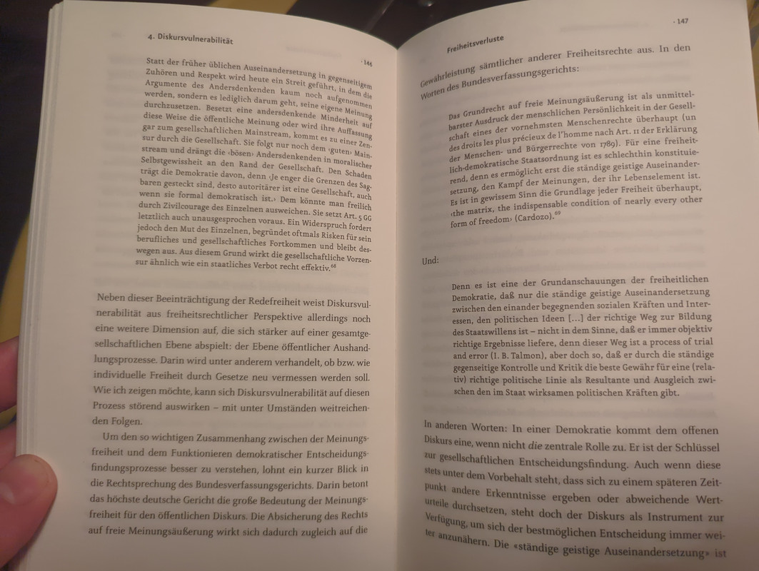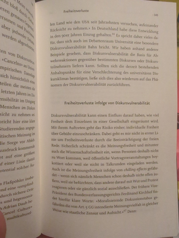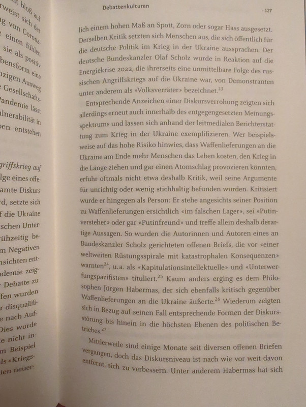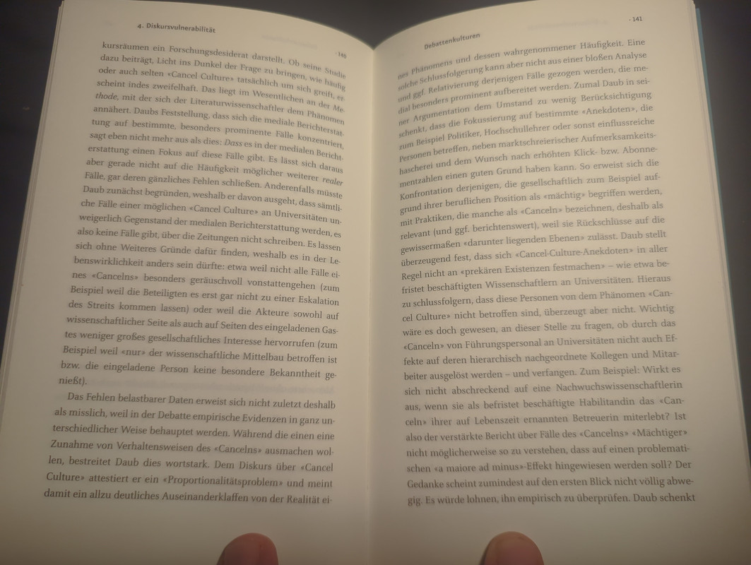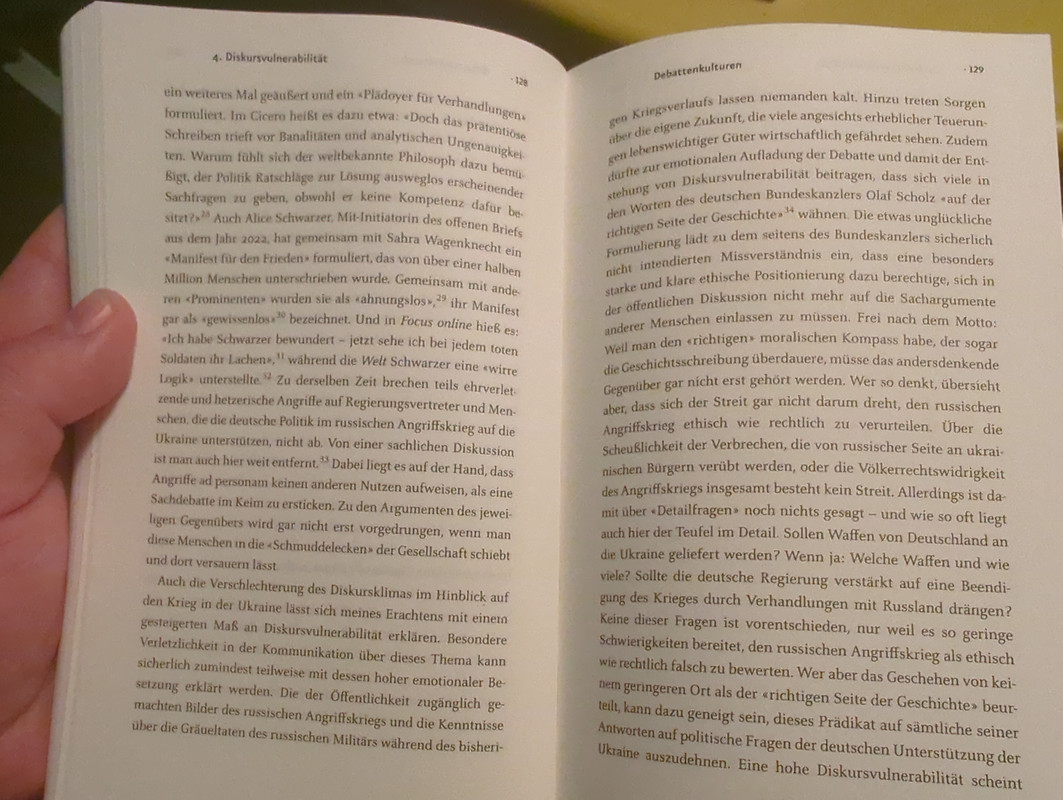 So werte Leser, wieder einmal ist es soweit euch zehn Bücher – oder besser gesagt Büchlein – vorzustellen. Frauke Rostalski - Die vulnerable Gesellschaft [https://www.amazon.de/Die-vulnerable-Gesellschaft-Verletzlichkeit-Herausforderung/dp/3406814611/?tag=maniacforum-21] [https://www.spektrum.de/rezension/buchkritik-zu-die-vulnerable-gesellschaft/2253795] Frauke Rostalski: Die vulnerable Gesellschaft – neue Verletzlichkeit als Herausforderung der Freiheit. [https://www.youtube.com/watch?v=HOSA2P_LIcc] Ole LieblDas Buch hatte ich schon länger auf dem Schirm, obiger Podcast hat es nochmal 'ne Spur interessanter gemacht und als auch noch Ole Liebl (cooler Wokie – ernsthaft!) es noch empfohlen hat (YT-Interview vin Jasmin Kosubek) war die Kaufentscheidung schnell gefallen. Nach dem Lesen hat es mich null gewundert wieso das Ding für das Sachbuch des Jahres nominiert war, aber es rennt bei mir auch offene Türen ein. Ihre Kernthese ist, dass „wir“ immer bereit sind persönliche Freiheitsrechte zugunsten der „Vulnerablen“ einzuschränken oder gar zu kippen. Diese aufkommenden bzw. schon vorhandenen Spannungsverhältnisse illustriert sie an diversen Themen bzw. Beispielen. Pandemiepolitik (Impfpflicht, Ausgangsperre), Rechtliche Konsequenzen (Hasspostings „Sie sind 1 Pimmel“, assistierter Suizid), Sprachregelungen Man sieht es auch hier im Forum: Die Diskursvulnerabilität nimmt zu, offener Diskurs wird proklamiert, aber schlicht nicht gelebt. Mal locker durch die Hose wäre angesagt. Interessant fand ich ihre Kritik an Adrian Daubs Methodik zu seinem Cancel Culture-Buch. Hätter er dort nicht nur die großen Meldungen in den Medien untersucht, so wäre er zu einem anderen Urteil als „nur Einzelfälle“ gekommen. Aber damit wäre wir wieder beim Thema MySide-Bias. Annie Ernaux – Die Scham [https://www.amazon.de/Scham-suhrkamp-taschenbuch-Annie-Ernaux/dp/3518471805/?tag=maniacforum-21] [https://www.ndr.de/nachrichten/info/Synapsen-Scham-verstehen-Ueber-die-Wucht-eines-Gefuehls,podcastsynapsen414.html] Ernaux stand nach ihrem Gewinn des Literaturnobelpreises bei mir relativ oben auf der Leseliste. Nachdem ich obigen Podcast gehört hatte, habe ich es insta bestellt. Anhand ihrer eigenen Biografie beschreibt Ernaux als soziologische Fallstudie ihren eigenen Aufstieg. Sie erkennt schon als Jugendliche Chansons und Phrasen ihrer Prekären Umwelt als Zeichen restringierter Sprache, was u.a. den Habitus (nach Pierre Bordieux) des eigenen Milleus ausmacht. In meiner Ausbildung hatten wir auch Psychologie, dort verwunderte dass man nach Paul Ekman Scham nicht als eine der dann insgesamt sieben Grundemotion ansah. Natürlich fragte ich damals nach wie das komme, die Antwort: Scham ist/wird kulturell geprägt. Sagen wir mal so, ich konnte mit 'ner Menge aus diesem Büchlein relaten. Irgendwas von Ernaux wird demnächst also bestimmt wieder eingetütet. Bruno Frank – Lüge als Staatsprinzip [https://www.amazon.de/L%C3%BCge-als-Staatsprinzip-Peter-Graf/dp/3946990843/?tag=maniacforum-21] Erst lange verschollen bevor es dann vom Verlag „Das Kulturelle Gedächtnis“ (geiler Name) letztes Jahr veröffentlicht wurde. [https://de.wikipedia.org/wiki/L%C3%BCge_als_Staatsprinzip] E.M. Forster – Die Maschine steht still [https://www.amazon.de/Die-Maschine-steht-still-Forster/dp/3455405711/?tag=maniacforum-21] Dank cervantes hatte ich in Teil 20 von Gerald Farcas Buch Playing Dystopia: Nightmarish Worlds in Video Games and the Player's Aesthetic Response berichtet. Farca zählte neben 1984 und Schöne neue Welt, sowie Samjetins Wir auch Forsters Novelle zu den prägenden Dystopien in Literaturform. Der Herr der Welt von Benson wurde nicht genannt. Die Oberfläche der Erde ist wie in der Serie Silo nicht mehr bewohnbar, weshalb die Menschen in unterirdischen Waben voneinander isoliert leben und nur noch per Bildtelefonie miteinander agieren. Körperlicher Kontakt ist pfui und überall das wacht die allmächtige Maschine. Die Novelle wurde vor 120 Jahren geschrieben! Visonäre Medienkritik. Mascha Kaléko - Ich tat die Augen auf und sah das Helle: Gedichte und Prosa [https://www.amazon.de/Ich-tat-die-Augen-Helle/dp/342328420X/?tag=maniacforum-21] Mein schönstes Gedicht Mein schönstes Gedicht ? Ich schrieb es nicht. Aus tiefsten Tiefen stieg es. Ich schwieg es. Wem ich jetzt noch erklären muss wieso weshalb und warum mich Malekos „Neue Sachlichkeit“ sofort berührte... Gedichte können ja doch was. Willi Münzenberg - Propaganda als Waffe [https://www.amazon.de/Propaganda-als-Waffe-Willi-M%C3%BCnzenberg/dp/375265936X/?tag=maniacforum-21] [https://www.rosalux.de/mediathek/media/element/2627] [https://www.youtube.com/watch?v=CJuAMOOBH4U] Durch obigen Podcast bin ich auf Willi Münzenberg gestoßen, definitiv ein interessanter Typ. Für das Forum aber anscheinend nicht interessant genug wie er den Propagandaapparat der Nazis aufdröselt. Sonst hätte sich zumindest eine Person hier gemeldet als ich das Buch komplett kostenlos inklusive Versand angeboten habe. Am Schluss könnte man sich womöglich auch noch politisch – grundlegend – weiterbilden. BTW: Meinungsvielfalt? [https://www.youtube.com/watch?v=O53fdlqjnqU] [https://www.youtube.com/watch?v=ZsGL94kxYGM] [https://www.baks.bund.de/de/die-baks/der-beirat] BTW2: Gibt es eigentlich einen bekannten Journalisten, der gegen die Wehrpflicht ist? Vielleicht können mir die BVB-Fans hier weiterhelfen. Ludwig Wittgenstein - Tractatus logico-philosophicus [https://www.amazon.de/Tractatus-logico-philosophicus-Ludwig-Wittgenstein/dp/3730610791/?tag=maniacforum-21] Wittgenstein ist krass, kommt an, haut dieses Büchlein raus, Micdrop und zieht sich dann aus der Philosophie (erstmal) lange zurück. Yukio Mishima - Sonne und Stahl [https://www.amazon.de/Sonne-Stahl-Autobiografischer-Yukio-Mishima/dp/3963117311/?tag=maniacforum-21] [https://de.wikipedia.org/wiki/Sonne_und_Stahl] Über den IG-Kanal „literartur_kanon“ bin auf diesen Essay
