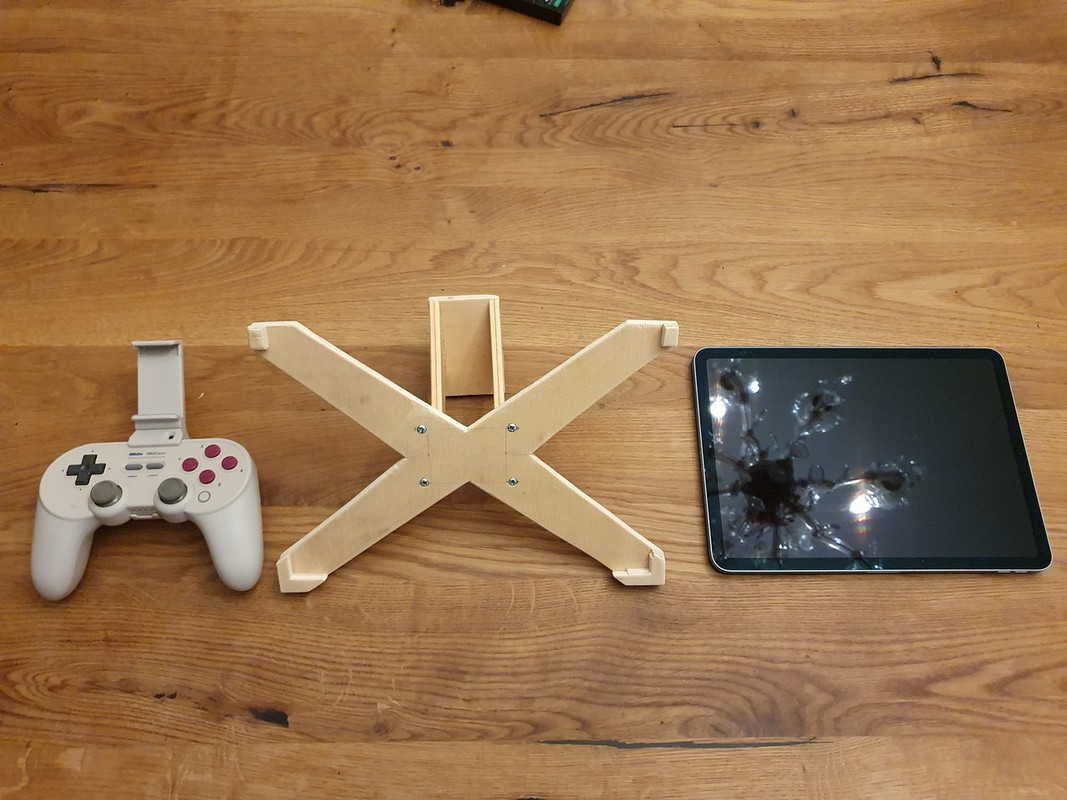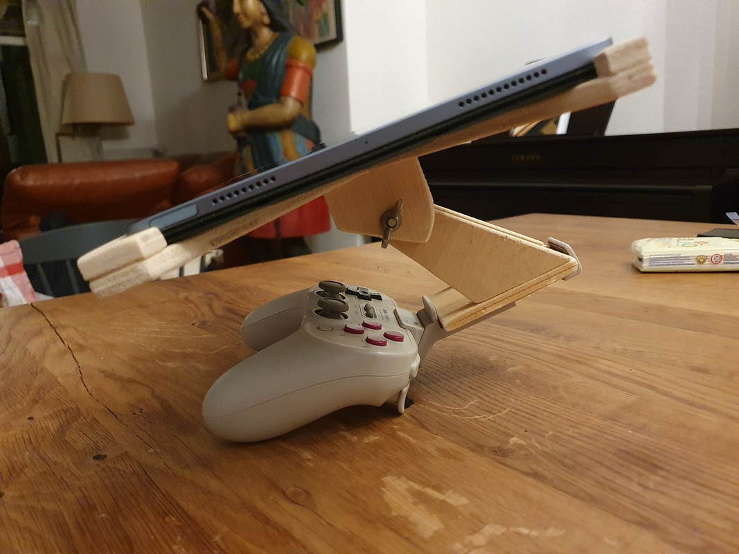 Seit ich für Elden Ring mal Steam Link ausprobiert hab und superzufrieden damit bin, bin ich auf der Suche nach einem Controller für mein iPad. Benutze die ganze Zeit schon einen 8bitDo SN30 Pro+, aber zum Zocken muss ich das iPad entweder auf den Tisch stellen (zu weit weg) oder an meine angewinkelten Beine lehnen (auf Dauer ungemütlich). Am liebsten hätte ich einen anständigen Controller, der links und rechts des iPads angebracht wird (so wie bei einer Switch, nur mit 10,5"), aber der einzige, den ich im Web gefunden hab, ist angeblich nicht mehr mit neueren iOS-Versionen kompatibel, also kann ich das vergessen. Hab jetzt lange über Möglichkeiten nachgedacht, das iPad mit einem Controller zu versehen, und viele Ideen gehabt und wieder verworfen. Heute hab ich dann endlich die Gelegenheit gehabt, einfach mal anzufangen. Hier das Ergebnis: [https://i.postimg.cc/Pf7kbG3K/20220305-204035.jpg] [https://i.postimg.cc/rmpvWg5v/20220305-203816.jpg] [https://i.postimg.cc/HncRvxZz/20220305-203953.jpg] [https://i.postimg.cc/59rTDBMm/20220305-203930.jpg] Der Tablet-Halter wird einfach in die Smartphone-Halterung des 8bitDo-Controllers eingesteckt. Die Idee ist, dass das iPad mittig über dem Controller sitzt, so dass möglichst keine Hebelkräfte wirken und ich keine Schmerzen in den Handgelenken bekomme. Da die Smartphone-Halterung nicht stark genug ist, ist alles noch etwas fragil, aber ich habe an der Platte, die in die Halterung eingespannt wird, Platz für Langlöcher eingeplant. Die Woche kommen dann Klettbänder, die den Smartphone-Halter und meinen Anbau fest verbinden sollen. Ich habe auch ein einfaches Scharnier eingebaut, so dass ich den Winkel des iPads frei einstellen kann. Erste Versuche sind vielversprechend verlaufen. Das ganze fühlt sich in etwa so schwer an, wie man sich eine 10"-Alu-Switch vorstellt. Leicht ist es also nicht (meine Halterung hat mit 130g aber ein zurückhaltendes Gewicht), aber sehr praktikabel. Bin gespannt, ob ich nach einer 2h-Session Elden Ring noch der gleichen Meinung bin. Habe mich da heute ca 6h mit der Bastelei beschäftigt und es hat einen Heidenspaß gemacht. Hatte nicht unbedingt das optimale Werkzeug da, aber in unserer Garage (in der es alles gibt, man aber immer mindestens 20min danach suchen muss) hab ich zusätzlich zum verwendeten Material und der perfekten Schrauben/Flügelmutter-Kombination eine Laubsäge gefunden. Zusammen mit der Stichsäge lief es dann ganz gut. Der Prozess wechselte zwischen sorgfältiger Planung und Trial&Error. Hatte z.B. extra viel Platz für meine Daumen eingeplant, dann aber beim Scharnier Teile unnötig groß gebaut. Die habe ich erst einfach an den relevanten Stellen abgesägt, später dann aber doch noch die gesamte Konstruktion angehoben, indem ich den Winkel der Teile an der Basisplatte erhöht habe. Das Ganze ist übrigens krumm und schief und teilweise reichlich dilletantisch umgesetzt, aber ich bin trotzdem stolz. Ist fast wie ein eigenes kleines Produkt. ^^ So, jetzt hab ich wieder statt zu zocken stundenlang meine Zock-Situation optimiert. Naja, morgen kann es ja dann weitergehen. |