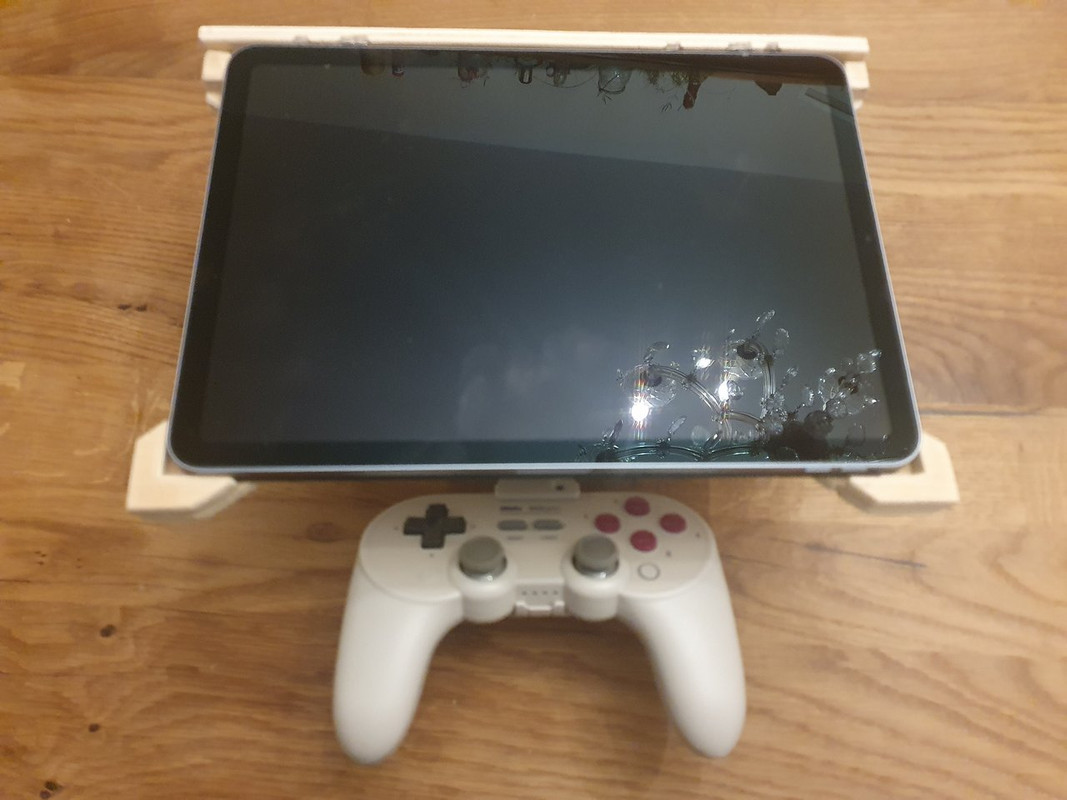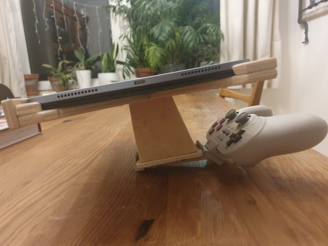 Habe nochmal größere Überarbeitungen vorgenommen. Die Möglichkeit das Tablet zu neigen hab ich ersatzlos gestrichen, nachdem sich herausstellte, dass 8bitDo sich beim Winkel des Smartphone-Halters etwas gedacht hat. Der ist einfach optimal, und der Stabilitätsgewinn ist beachtlich, bzw verschwindet die Notwendigkeit, das Scharnier zu fixieren - das ging mit den Flügelschrauben angesichts des Gewichts des iPads einfach nicht richtig. Vorher wollte ich das iPad mit Gummibändern im Rahmen fixieren, was nicht besonders gut klappte. Jetzt beruht die Fixierung auf einer Reihe Neodymmagnete, die ich auf einer weiteren Leiste oberhalb des iPads eingeklebt habe. Ich würde die Konstruktion nicht unbedingt kopfüber halten, aber zum Zocken im Bett oder auf der Couch reichts. [https://i.postimg.cc/MZF3gZH4/20220306-195629.jpg] [https://i.postimg.cc/ZqHVH4Xw/20220306-195639.jpg] Inzwischen habe ich auch eine gute Stunde Elden Ring mit dem Bumms hinter mir, und es ist überraschend stabil und unproblematisch. Da ich diverse Winkel und Maße noch angepasst habe, ruht das Gewicht gut verteilt auf dem Controller, und den lege ich sowieso im Schoß ab, so dass relativ wenig Ermüdungserscheinungen auftreten. Zwischendurch habe ich schon das Bedürfnis, meine Handgelenke zu bewegen, aber es ist weit angenehmer als "iPad an meine Beine lehnen und versuchen, den Controller nicht im Weg zu haben". Nach dem kleinen Probelauf bin ich superhappy mit dem Ergebnis. Das Produkt ist etwas weniger schief als gestern, sieht aber um einiges abgerockter aus, weil die Änderungen ein oder zwei Bohrlöcher offen zurückgelassen haben und die Magnete superhässlich eingeklebt sind. Das ist mir aber wumpe, denn der Komfortgewinn ist immens. Und der Spaß an der Arbeit hat den Zeitaufwand sowieso gerechtfertigt. |