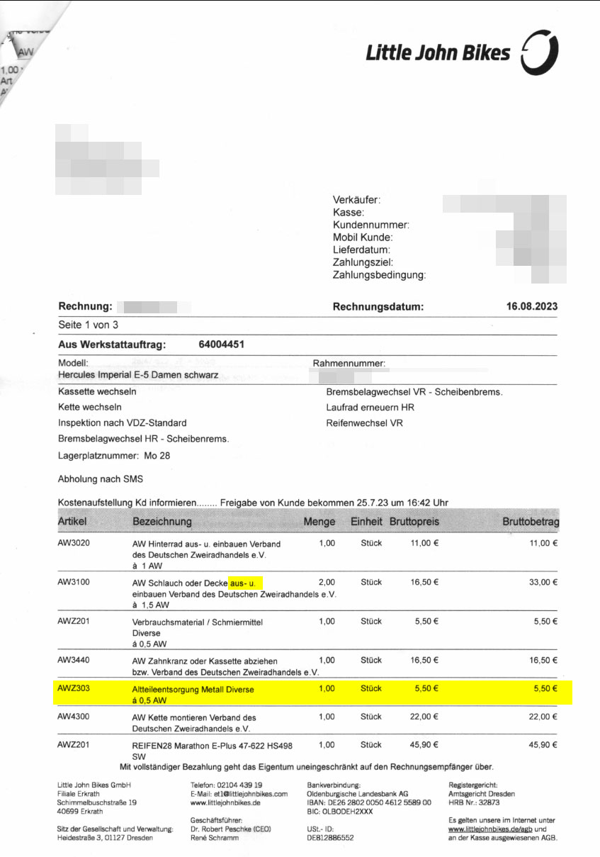 [https://demolitionsquad.de/extras/maniac/a0.jpg] [https://demolitionsquad.de/extras/maniac/a1.jpg] [https://demolitionsquad.de/extras/maniac/a2.jpg] [https://demolitionsquad.de/extras/maniac/a3.jpg] Also was gemacht werden muss, muss gemacht werden ABER: - 7x Altteile Entsorgung für 33€? - Immer brav "AUS UND einbau" Berechnet wenn doch die alte Felge komplett entsorgt wurde und ne neue mit Bremsscheibe und Kassette rein... - Unabgesprochen die (neuen!!!) Bremsbeläge mit getauscht und das Kettenschutzblech gewechselt und dafür dann noch 110€ Inspektion Berechnet. Und ich glaub das is alles Netto. XD |
