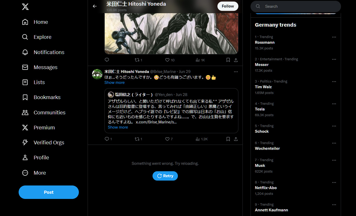 >Hast du mal einen Beispiel-Account plus die Info wie weit du zurückgehen willst? Ich meine nicht, dass das eingeschränkt ist für eingeloggte Nutzer. Eventuell ein Problem mit aktivierten Werbeblockern? bin eingeloggt und hab UBlockO deaktiviert. Hier z.b. beim Account von Hitoshi Yoneda (japanischer Illustrator), kann ich gute 6 Wochen zurückscrollen (siehe Bild unten), danach geht's nicht weiter. Das ist jetzt vielleicht ein bisschen ein extremer Account, weil der soviel postet, aber ich hab das Problem allgemein und würde halt bei Usern, die z.b. nur ein Posting pro Woche absetzen, schon gerne mal die letzten paar Jahre durchscrollen. [https://x.com/Brise_Marine] Wenn ich z.b. ein spezielles Posting (das älter ist) über Google finde, kann ich das einzeln aufrufen, wechsle ich dann aber die Account Timeline, kann ich durch scrollen NICHT zu dem eben gelesen Posting (via Goggle Link) gelangen. [http://pms.hazard-city.de/hitoshi_yoneda_X.jpg] |