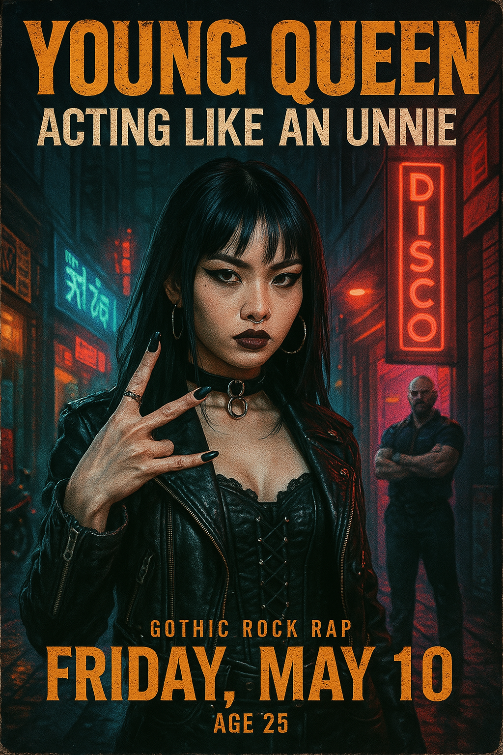 [https://maniac.videogamers.de/Young%20Queen%20-%20Acting%20like%20an%20Unnie.png] Prompt: "bitte ein werbeplakat für ein konzert für eine künstlerin mit dem namen "Young Queen" und den konzerttitel "Acting like an unnie" erstellen. die künstlerin ist eine 25jährigen vietnamesin die gothic rock style trägt und in einer cyberpunk artigen straßenszene für ein rap album posiert. sie soll eine rap / hip hop typische handgeste (gang sign) machen. außerdem soll im hintergrund ein türsteher den eingang zu einer discothek bewachen." |