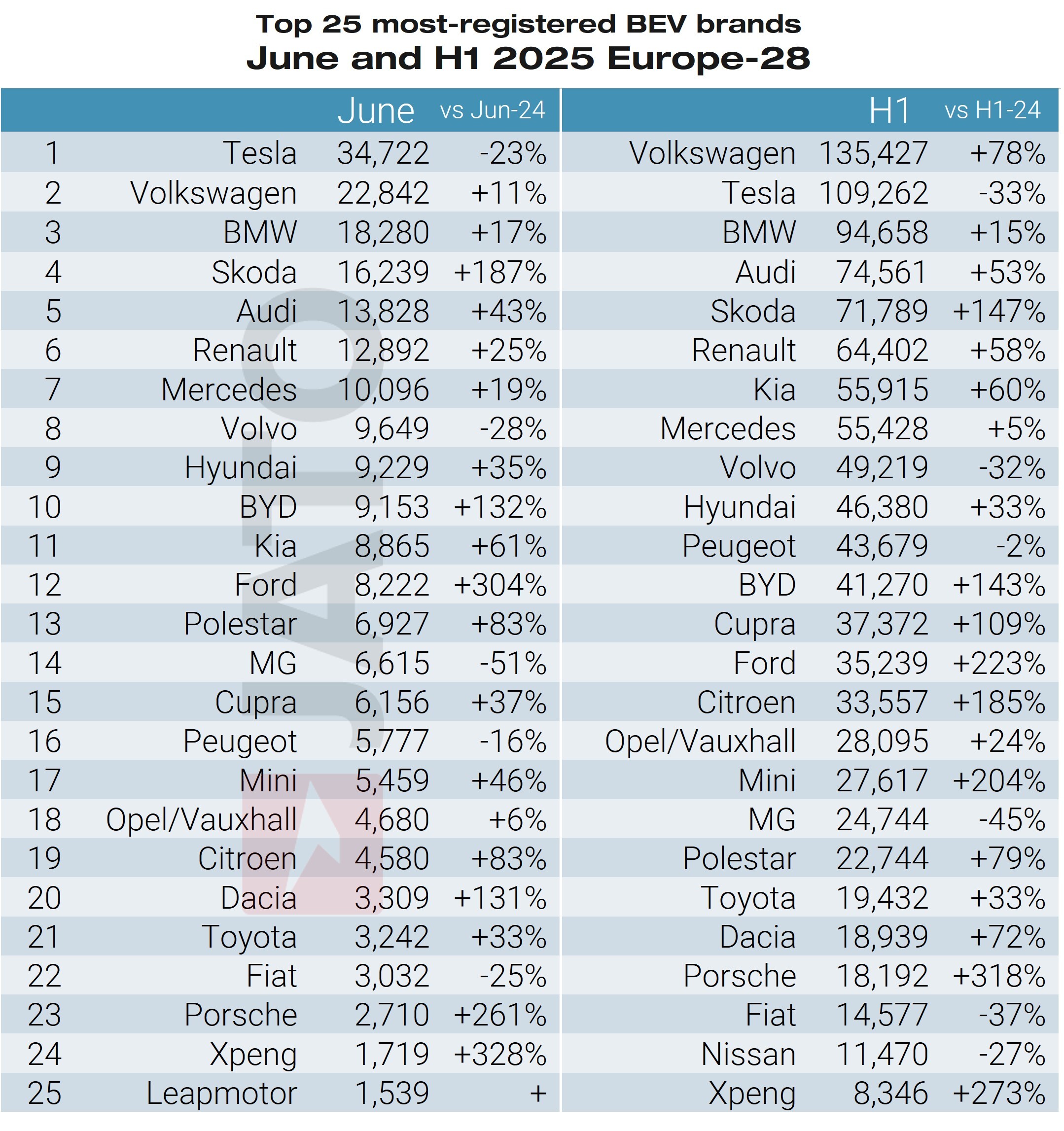 >Teslas Problem zumindest auf dem europäischen Markt ist Elon Musk und nicht der Preis der Karren. Man kann sich dahingehend aber auch ehrlich machen und anerkennen, dass das Thema langsam an Relevanz verliert - selbst in Deutschland. Musk ist jetzt gegen Trump, DOGE ist aus den Medien verschwunden. Weiter unten schrub auch jemand, dass die ganzen Geschichten (also die groteske AFD-Werbung, vermeintlicher Hitlergruss, etc) irgendwann in Vergessenheit geraten werden - also genau wie Diesel-Skandal, Masken-Deals und Co. Davon gehe ich auch aus und irgendwann haben insbesondere die deutschen Medien auch wieder ein neues Lieblingsthema. Die Politik vor der eigenen Haustür gibt ja aktuell bereits einiges her - ansonsten: Trump. Was die EU-Zulassungsstatistik (nicht zwangsläufig Verkäufe, siehe weiter unten) angeht, kann man ja auf die Charts schauen. [https://20190729.fs1.hubspotusercontent-na1.net/hub/20190729/hubfs/Top%2025%20bestselling%20BEV%20brands-4.jpg] Tesla als Marke ist die Nummer eins im Juni und Nummer 2 für das erste Halbjahr in 2025. Nach Modellen stünden sie in beiden Bereichen auf Platz 1. [https://20190729.fs1.hubspotusercontent-na1.net/hub/20190729/hubfs/Top%2025%20bestselling%20BEV%20models-4.jpg] Was oft unter den Teppich gekehrt wird, ist außerdem, dass Teslas fast zu 100% an Endkunden durchverkauft werden. Keine Tageszulassungen, die sich dann bei Händlern stapeln oder garantierte Flotten-Abnahmen von Konzernen, die einer VW kaum Marge einbringt. Glaube jedenfalls nicht, dass viele Leute jemanden kennen, der privat ein IDx-Modell gekauft hat, weil das Auto überzeugt hat. Tesla ist im BEV-Bereich imho eher eine "Volksmarke" als VW. Aber ich lasse mich gerne vom Gegenteil überzeugen, wenn jemand die privaten Zulassungsstatistiken von VW auftreiben kann. Ging der Tesla-Absatz runter? Mit Sicherheit. Gab es dafür AUCH Gründe abseits "Musk-Hate"? Natürlich (z.B. Model Y-Umstellung). Hat Tesla einen Imageschaden durch das politische Involvement Musks abbekommen? Aber hallo, da kann man kaum widersprechen. ABER: das Fahrwasser wird dahingehend immer ruhiger, die Marke als solche erholt sich auch in der EU, d.h. andere Tesla-Themen sind jetzt wieder im Vordergrund (Autonomie, günstigeres Model Y, der Roadster guckte kürzlich mal wieder um die Ecke, Energiesparte, xAI...). Natürlich kann sich das täglich mit einem X-Posting von Musk wieder ändern, aber aktuell geht's bei Tesla tatsächlich wieder um - ja, Tesla. |